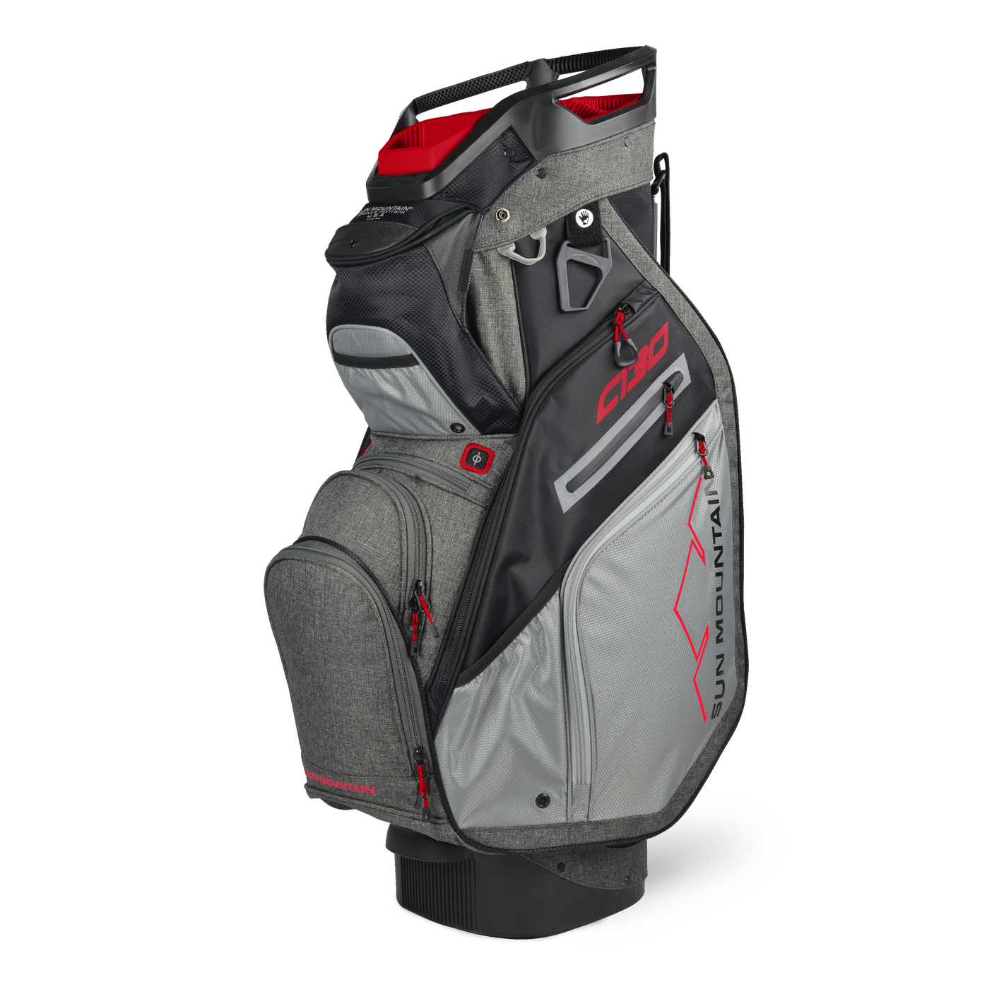 The C-130, Sun Mountain’s best-selling cart bag, was created to work optimally on a cart. All of the features are designed with cart use in mind, starting with the reverse orientation top with three utility handles, cart bumpers, the Smart Strap System and a convenient, roomy, velour-lined rangefinder pocket with a magnetic closure. In addition, all pockets are forward-facing and accessible when the bag is on a cart.