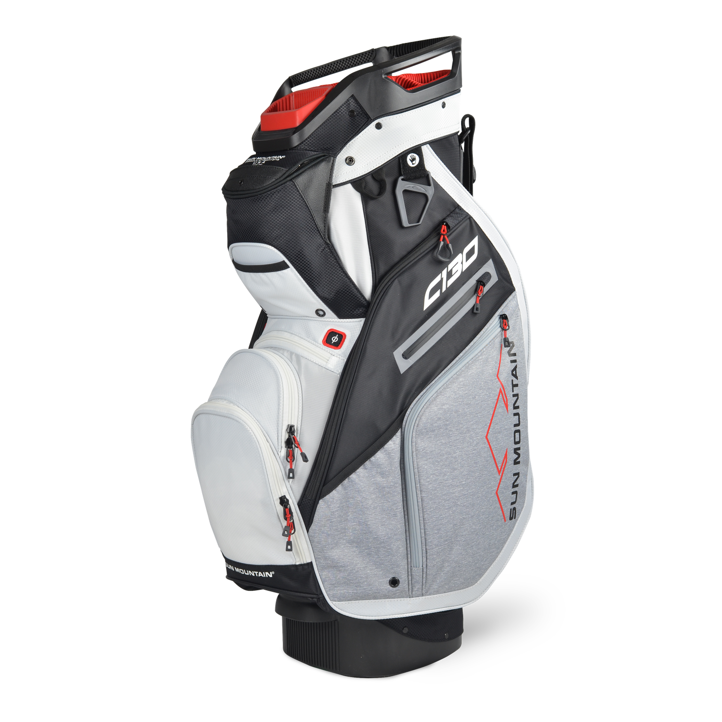 The C-130, Sun Mountain’s best-selling cart bag, was created to work optimally on a cart. All of the features are designed with cart use in mind, starting with the reverse orientation top with three utility handles, cart bumpers, the Smart Strap System and a convenient, roomy, velour-lined rangefinder pocket with a magnetic closure. In addition, all pockets are forward-facing and accessible when the bag is on a cart.