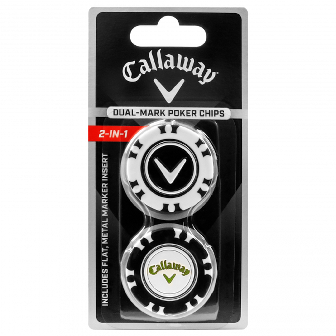 Callaway Dual Mark Poker Chip Ball Markers offer 2-in-1 convenience and help eliminate pocket clutter. No more tedious searching for your flat marker when your ball is in someone else's line, the Callaway Dual Mark includes a larger, real-feel poker chip for general ball use, and an integrated, interior flat metal marker when obstructing other players' line. Comes in a 2-pack with multiple, interchangeable color/marker options.