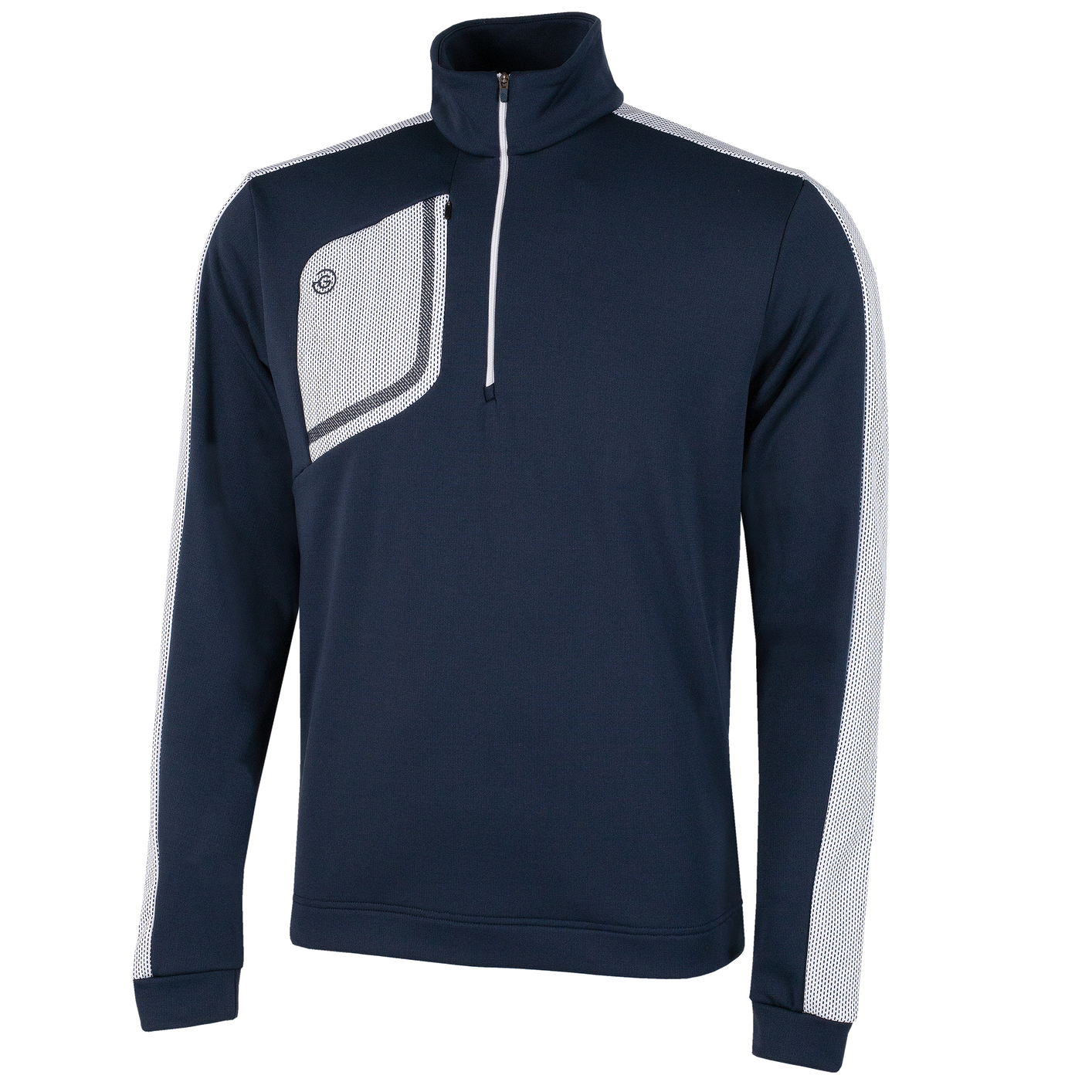 Half-zip sweater delivers outstanding thermal insulation. Durable, breathable and easy care. Details such as pipings and prints make it very presentable both on and off the course. This garment belongs to a new eco-generation of INSULA fabric made 100% from recycled plastic bottles.