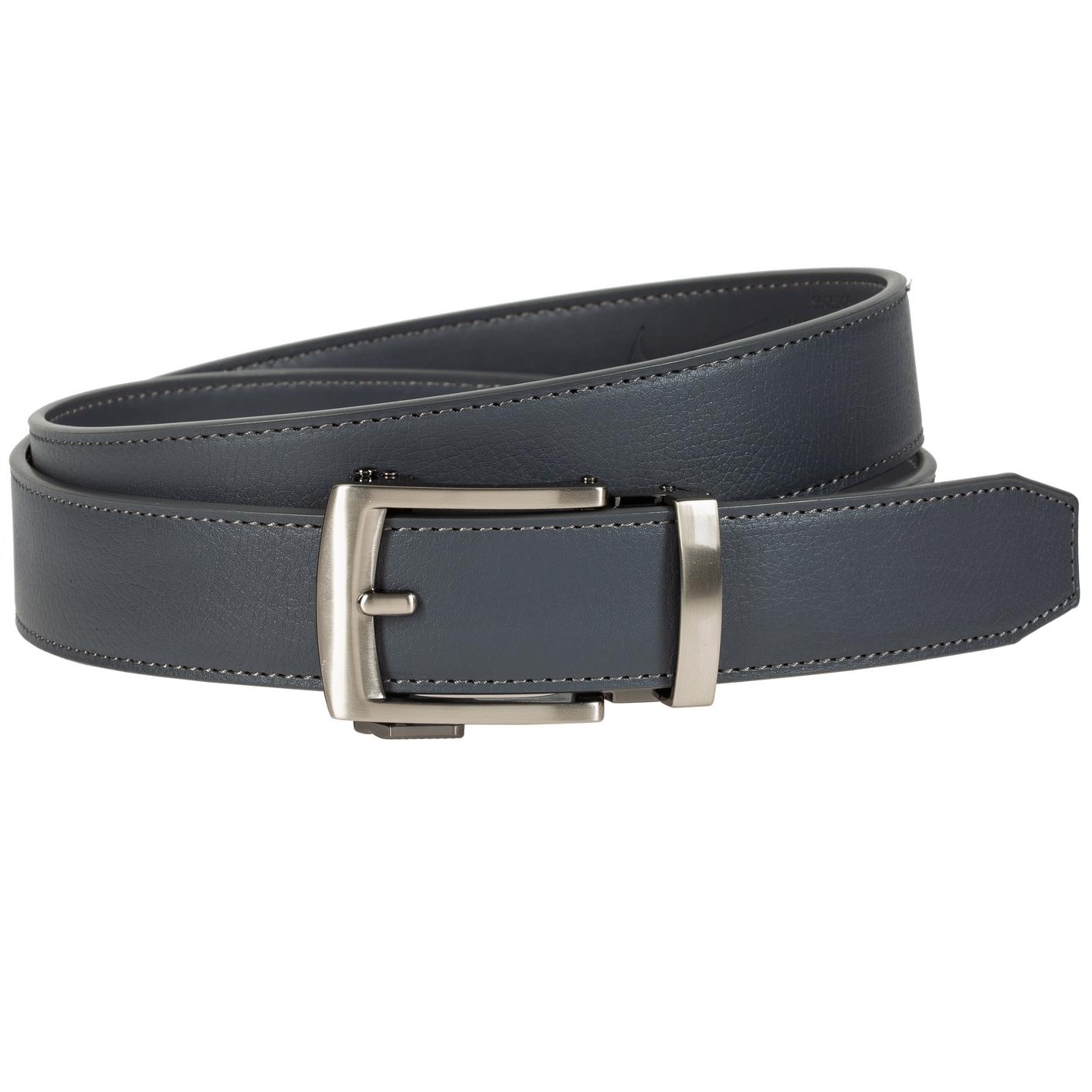 - Brushed gunmetal ratchet buckle with laser 'swoosh' Logo