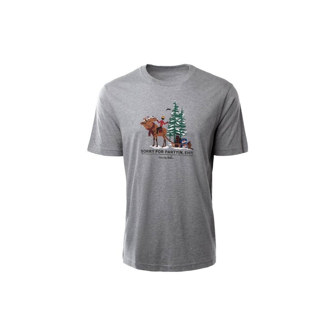 - Graphic t-shirt featuring a Mountie, moose, beer, and the words, “Sorry for Partyin’, Eh?”