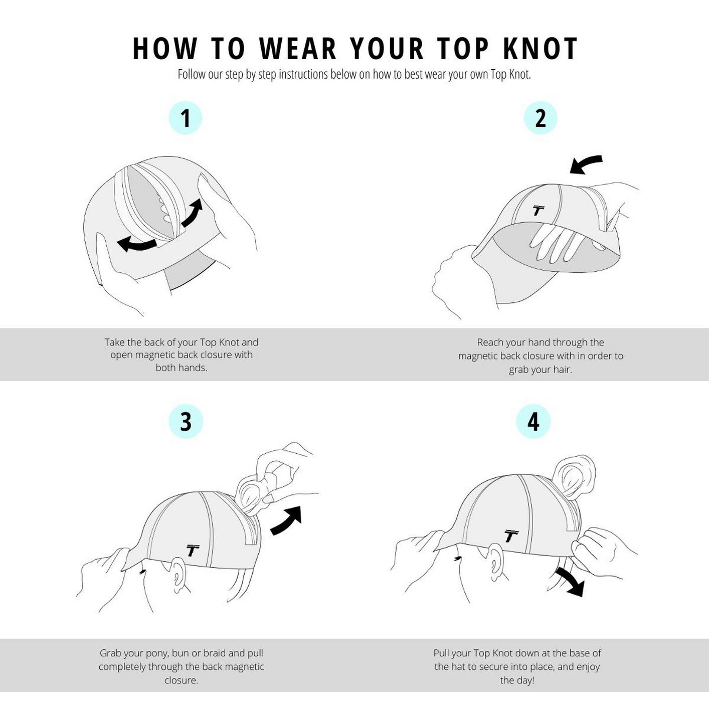 Our Performance Wear hat pairs best with your next sunny day on the course. With our patented high back closure, hit your next drive without worrying about your hair getting in the way. And with our sweat-wicking fabric, Top Knot will keep you cool all day long.